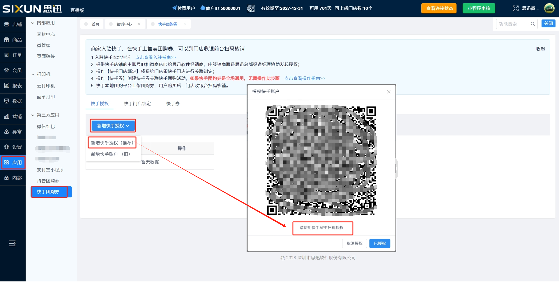 方式一、快手商家App扫码自助授权(新增快手授权(推荐))